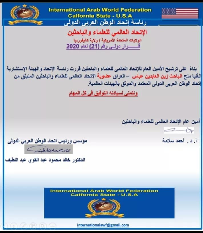 الأتحاد العالمي للعلماء والباحثين الولايات المتحدة الأمريكية/ ولاية كاليفورنيا . زين العابدين عباس ناصر الصافي 6 سنوات ago بطاقة عضوية دولية