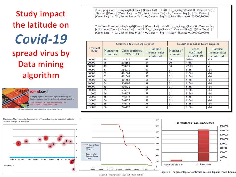 (COVID-19) هو مرض معدي يسببه فيروس جديد ، ويسبب الفيروس أمراض الجهاز التنفسي مع أعراض مثل السعال والحمى بعد مهاجمة جسم الكائن البشري، ويسبب الالتهاب الرئوي في الحالات الأكثر شدة.. انتشر فيروس كورونا الجديد ، أو ما أصبح يعرف باسم “COVID-19” ، إلى أكثر من 79 دولة خارج الصين ، حيث تعد منطقة ووهان مركز الفيروس. حتى الآن لم يكتشف الباحثون لقاح COVID-19 . بالنسبة في ما يخص الانتشار ، هناك دول انتشر فيها الفيروس بشكل كبير ملحوظ ، والبعض الآخر في المتوسط وأقل من ذلك ، مع ذلك هنالك دول حتى الآن حيث لم يثبت انتشار الفيروس فيها. هذه الورقة البحثية اعدت لمساعدة العلماء والباحثين الذين لا يزال عليهم العمل على اكتشاف اللقاح ، مع الأخذ في الاعتبار أهمية انتشار Covid-19. استخدام مجموعة البيانات من Kaggle عن طريق تعدين هذه البيانات باستخدام خوارزميات التصنيف التنقيب عن بيانات الانحدار الخطي للوصول الى المعرفة من البيانات المفيدة. يعتمد هذا البحث على دراسة تأثير خط العرض الجغرافي على معرفة انتشار COVID 19 في الحالات المؤكدة.