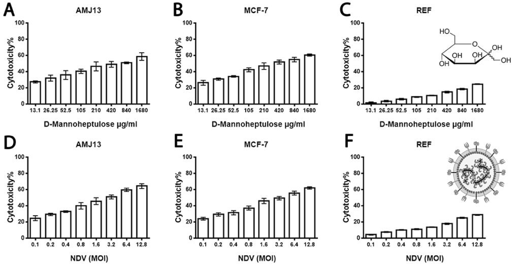 Background: Most cancer cells exhibit increased glycolysis and use this metabolic pathway cell growth and proliferation. Targeting cancer cells’ metabolism is a promising strategy in inhibiting cancer cell progression. We used D-Mannoheptulose, a specific hexokinase inhibitor, to inhibit glycolysis to enhance the Newcastle disease virus anti-tumor effect. Methods: Human breast cancer cells were treated by NDV and/or hexokinase inhibitor. The study included cell viability, apoptosis, and study levels of hexokinase enzyme, pyruvate, ATP, and acidity. The combination index was measured to determine the synergism of NDV and hexokinase inhibitor. Results: The results showed synergistic cytotoxicity against breast cancer cells by combination therapy but no cytotoxic effect against normal cells. The effect was accompanied by apoptotic cell death and hexokinase downregulation and inhibition to glycolysis products, pyruvate, ATP, and acidity. Conclusions: The combination treatment showed safe significant tumor cell proliferation inhibition compared to monotherapies suggesting a novel strategy for anti-breast cancer therapy through glycolysis inhibition by hexokinase downregulation.