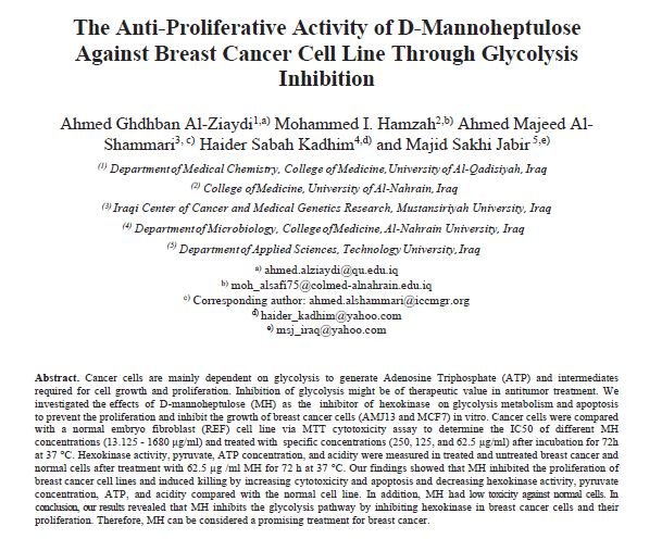 The anti-proliferative activity of D-mannoheptulose against breast cancer cell line through glycolysis inhibition د. احمد غضبان ثعبان الزيادي 5 سنوات ago https://scholar.google.com/citations?view_op=view_citation&hl=en&user=IbHlPhIAAAAJ&citation_for_view=IbHlPhIAAAAJ:Y0pCki6q_DkC